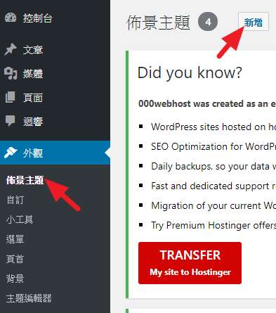 登入帳號密碼後,選擇外觀>佈景主題>新增。