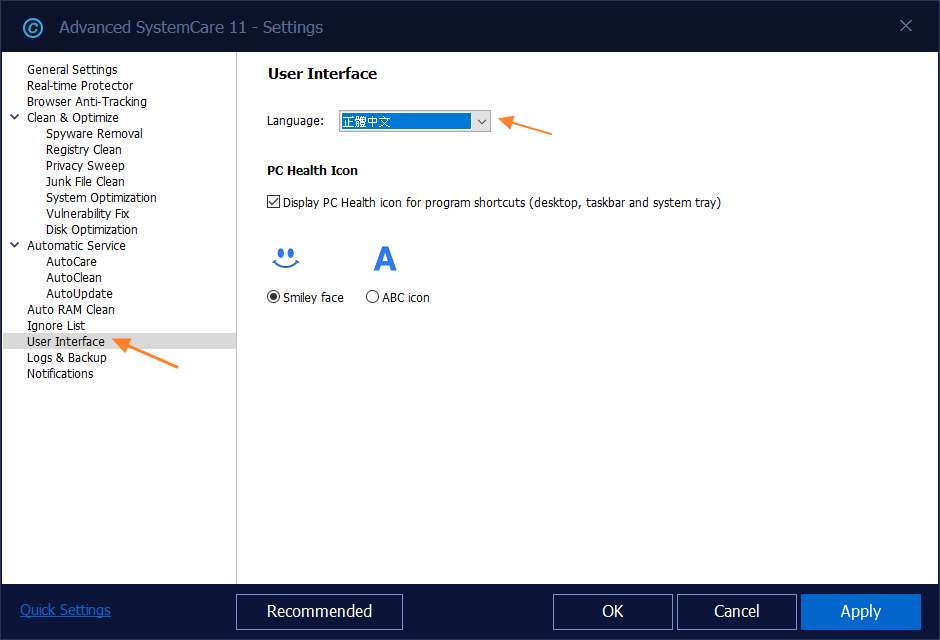 選擇User Interface > 在右邊Language選擇正體中文>右下點Apply