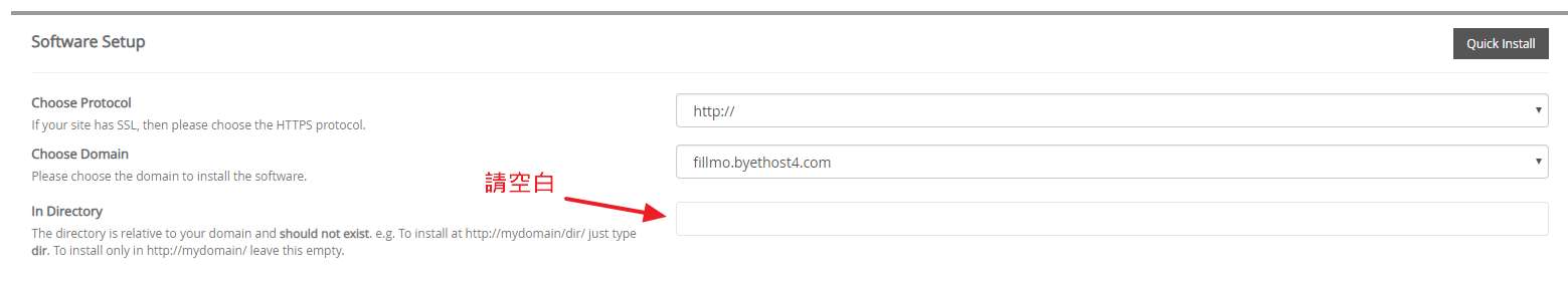 將In Directory 留空白,這樣才會安裝在根目錄,網址才不會難看。
