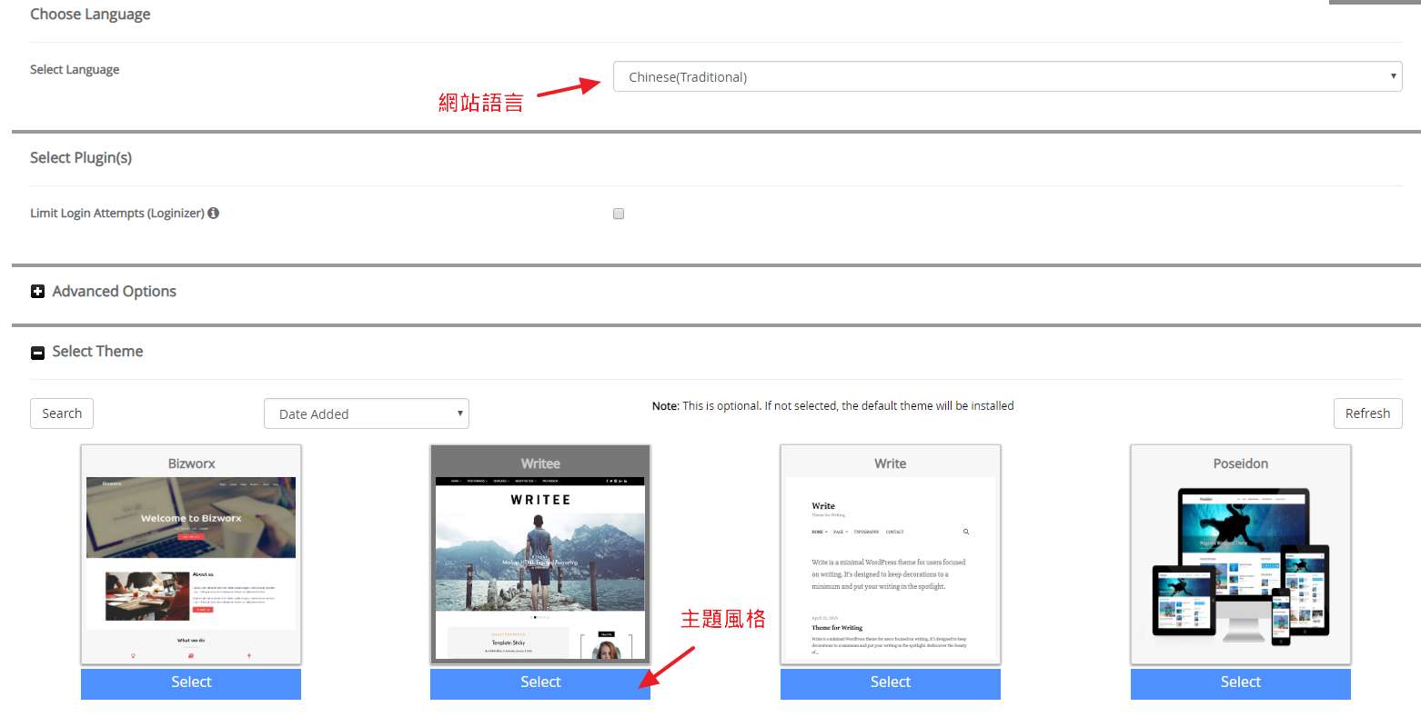 選擇網站語言、主題’風格隨便選一個,之後到後台在選擇你喜歡的主題風格。