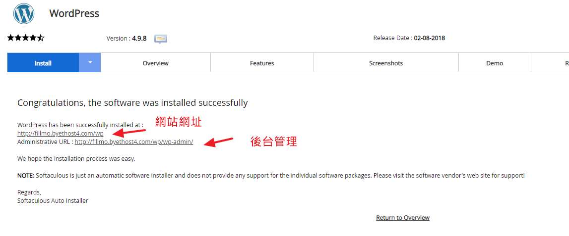 安裝完後會顯示網站前台、與後台網址。