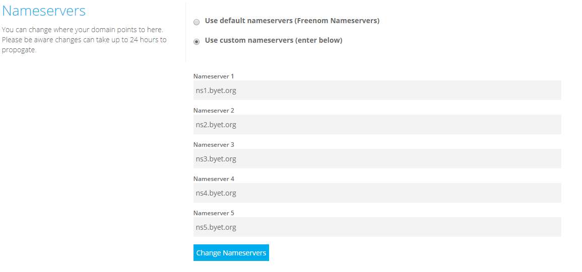 使用自己的網域,這裡是使用免費網域tk,my.freenom.com,到網域管理系統上輸入Byet的NS。