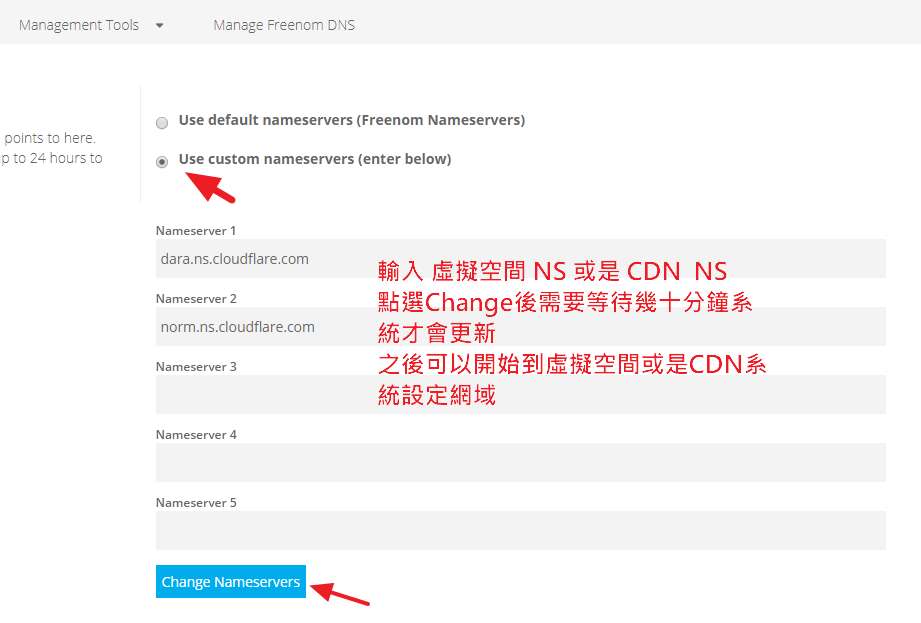 選擇第二項 Use custom nameservers (enter below) 更新後需要等幾十分鐘就完成啦,之後到CDN設定你的DNS或是虛擬空間新增網域。