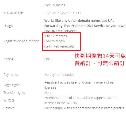 官方對於免費網域的續訂說明