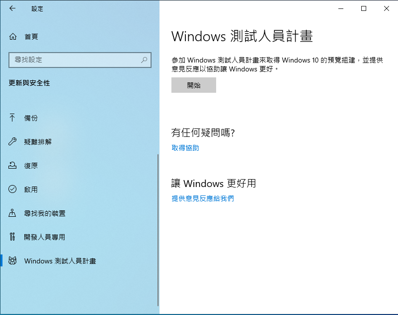 按下"開始"可以註冊Windows 測試人員計畫