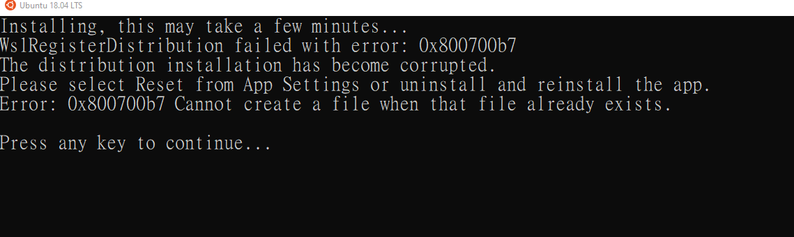 開啟Ubuntu 遇到0x800700b7,解決方法是移除在安裝一次。