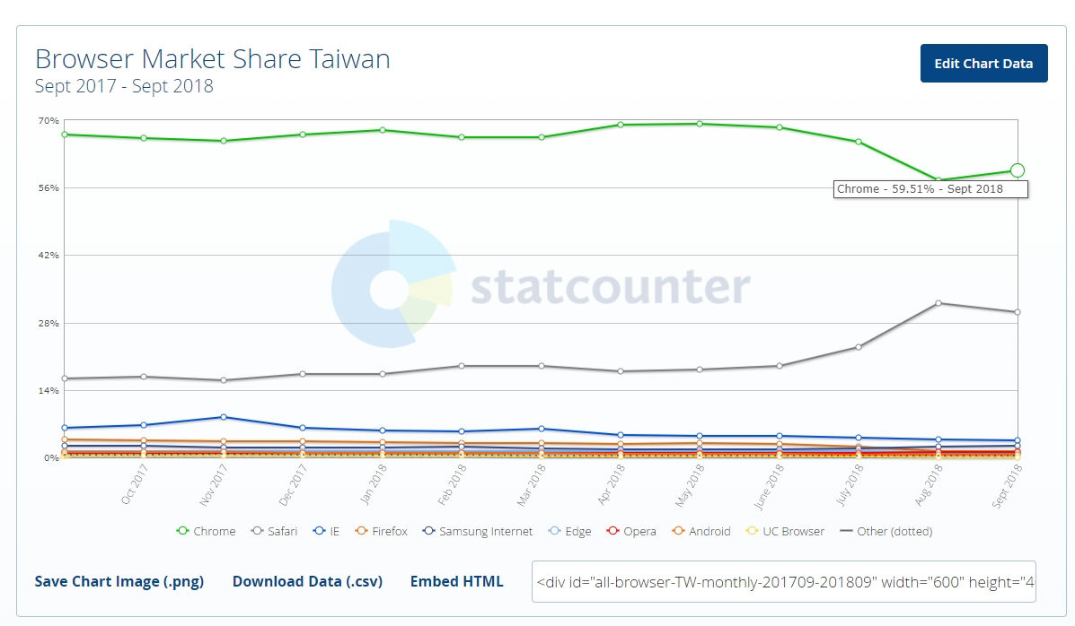查詢台灣的瀏覽器市佔率,最高是Chrome瀏覽器