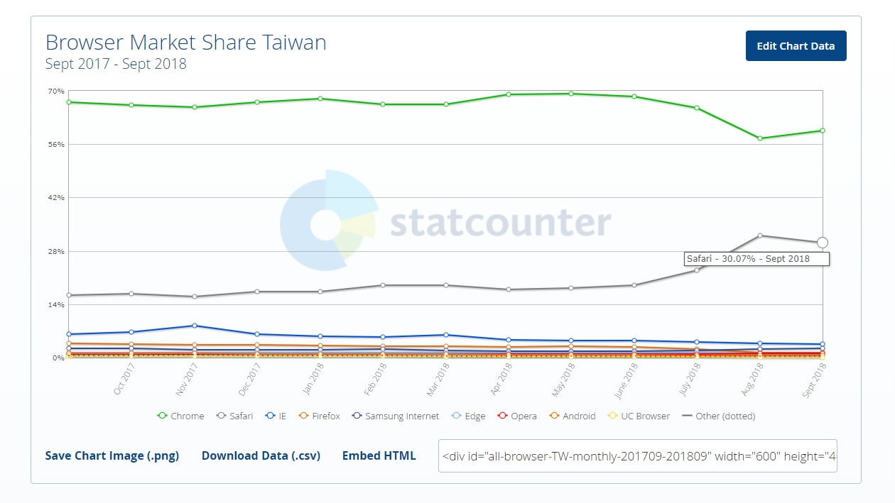 第二高是Apple的Safari瀏覽器,代表台灣使用Apple設備的非常多