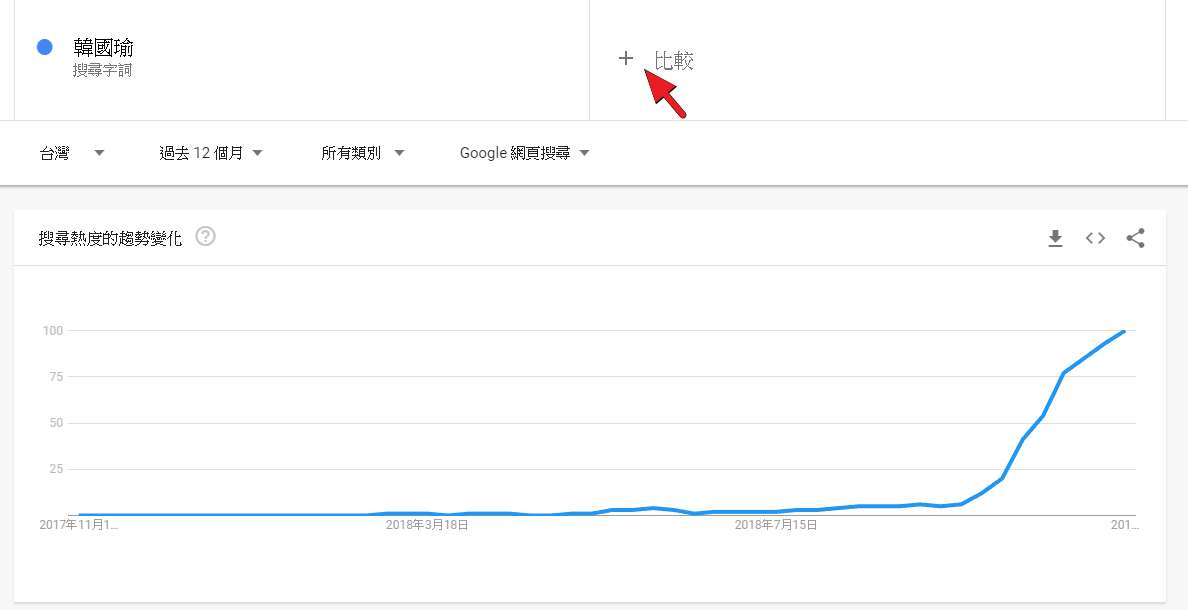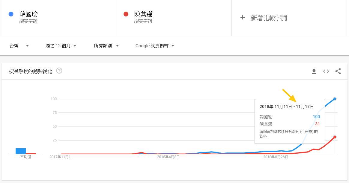2018/11/18搜尋韓國瑜與陳其邁來比較熱度,因2018/11/24是台灣九合一選舉,在2018/11/18搜尋距離選舉還有一個禮拜時間,網路聲量會非常大,分析看看搜尋熱量,搜尋框搜尋”韓國瑜”。