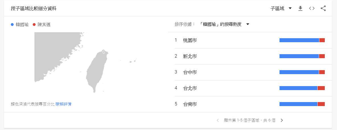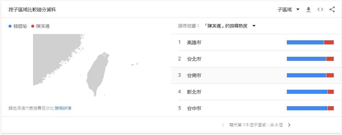 往下滑可以看到六都搜尋排行,韓國瑜幾乎都是北部搜尋度高,點選排序依據的”「韓國瑜」的搜尋熱度”可切換至陳其邁。