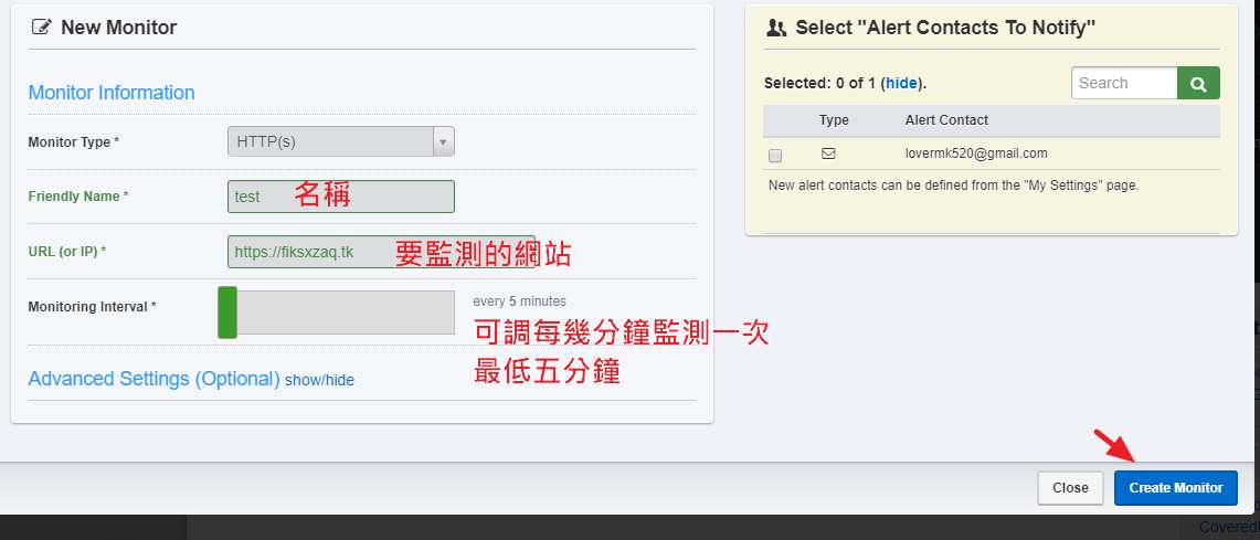 名稱隨便取都可以,輸入要監測的網站、調整每幾分鐘監測一次,默認是五分鐘,點選Create Monitor即可完成,可至Dashboard觀察你的網站狀態。