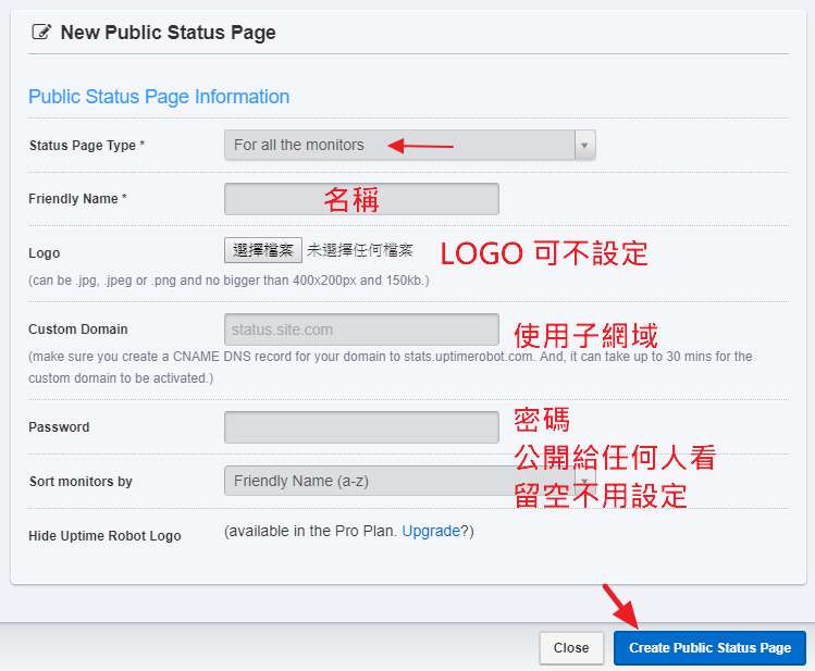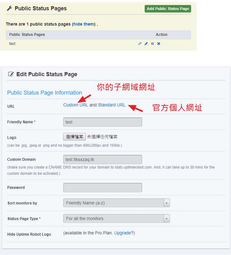 設定監測網站頁面,如圖片,Custom Domain可綁定你的子網域,需要到你的DNS設定,CNAME紀錄 指定 子網域.com stats.uptimerobot.com,解析需要時間。