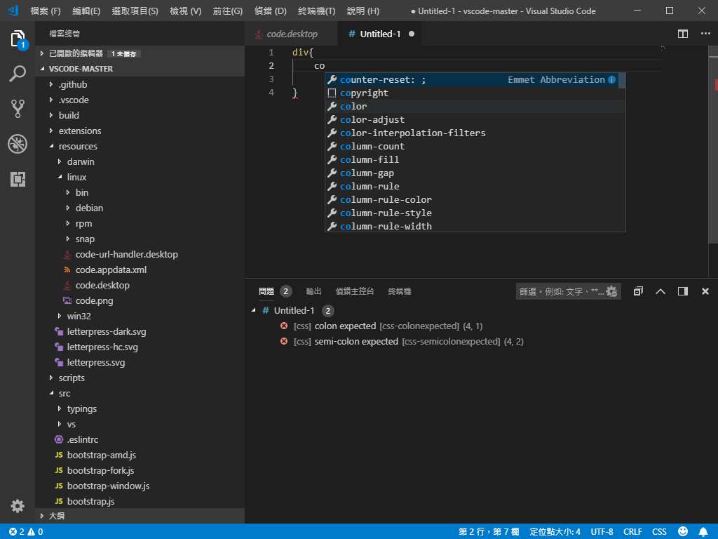 文件設定為css,只需要打個開頭co會顯示出co開頭的css程式碼。