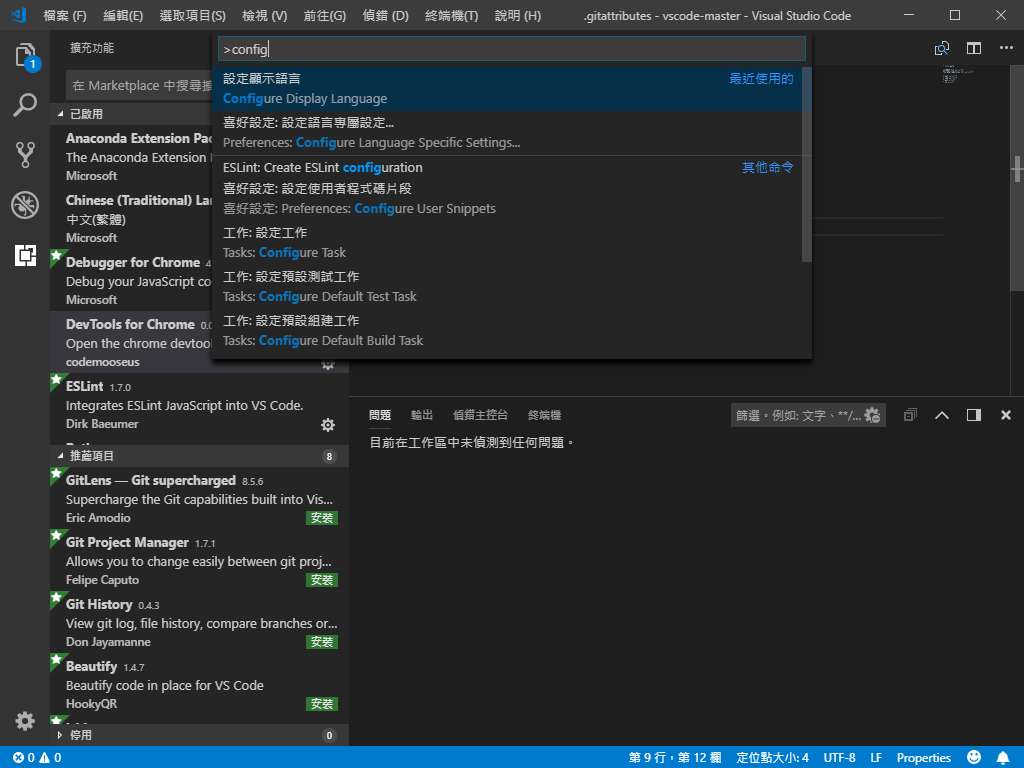 修改語言設定為中文繁體,Shift+Ctrl+P呼叫命令,搜尋 config。