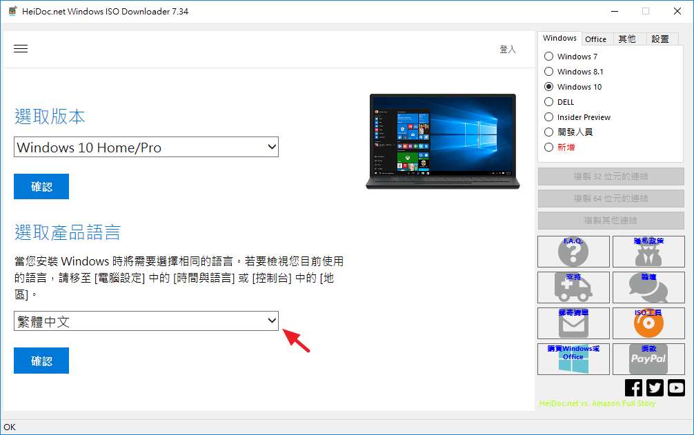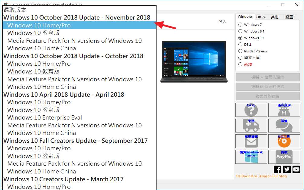 右邊選擇要下載的類型,選單選擇版本,選擇最上面的即可內含更新檔最新,一般只要選Home/Pro就可以了。