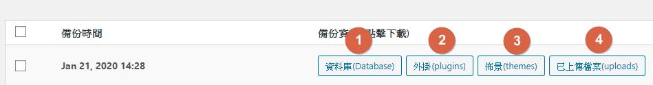 備份完成後需要將資料下載,共有4個資料,資料庫,外掛,佈景,上傳檔案。