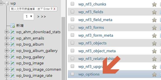 選擇資料庫 例如wp > 選擇資料表 wp_options。